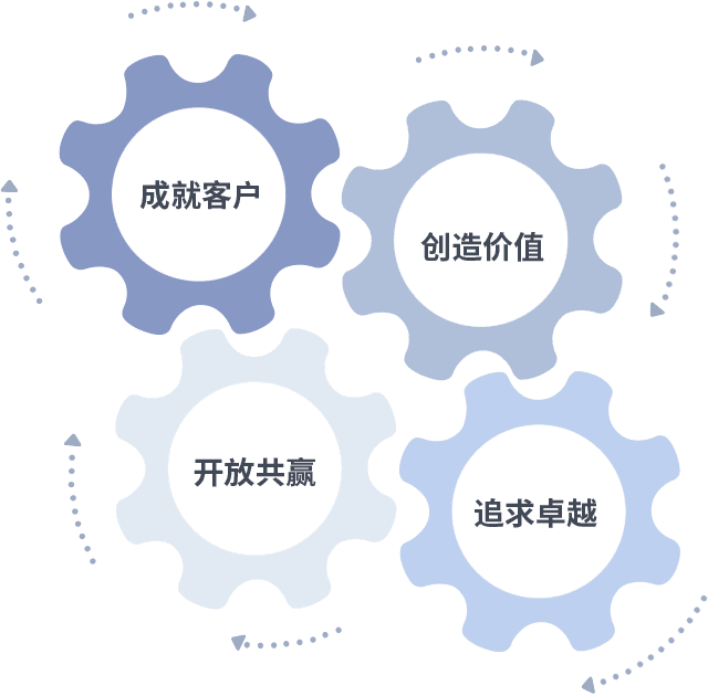 成就客户是一切决策的出发点,,,,创造价值是衡量所有工作的标准,,,,追求卓越是我们做事做人的态度,,,,开放共赢是我们的格局也是最终的结果。。。价值观的齿轮环环相扣,,,,推动着组织里的每个人不断向前。。。