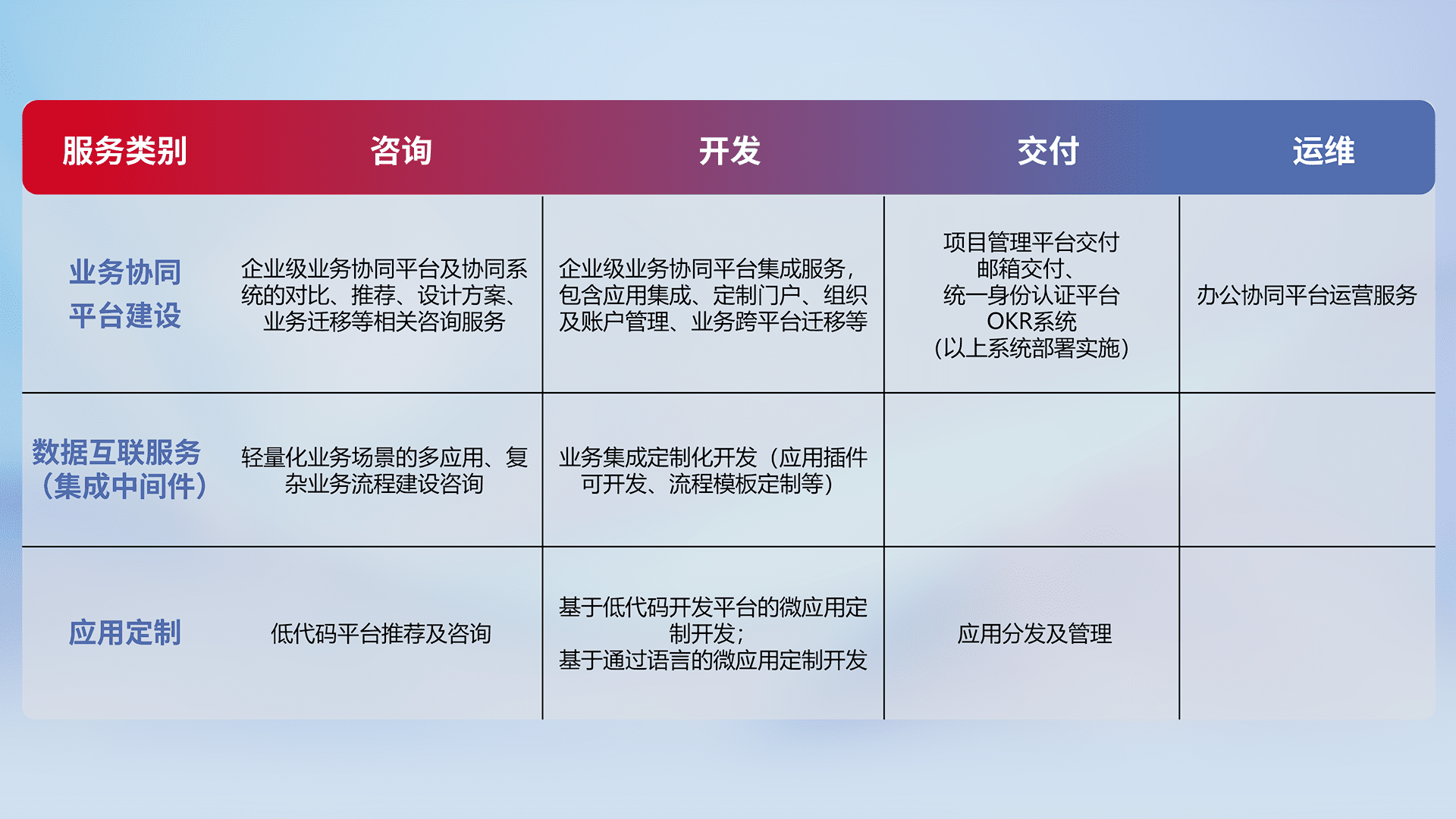 针对钉钉、、、企微、、IDaas等平台级产品提供产品的规划、、方案、、、、交付、、定制化开发等服务,,,,实现如统一协同办公、、、、智能客户服务、、、混合会议管理、、、、智能数据查询、、等业务场景,,,实现数字化转型。。