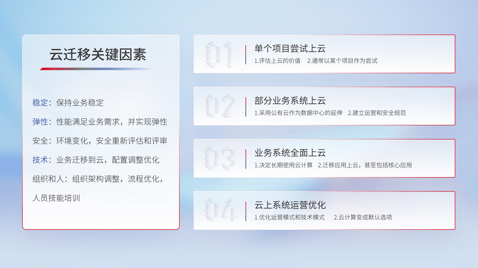 结合实际业务,,,从规划设计、、云平台选型、、、、云原生改造、、数据迁移、、、、集成交付,,,迁移全过程为客户识别最佳上云路径,,,,做好风险识别管理,,,设计网络架构、、、、身份权限、、、安全审计合规、、、、操作审计、、、日志审计、、、监控告警策略、、、、多站点容灾设计等,,,,对云上基础设施进行整体规划,,提升IT治理水平,,以满足弹性、、高可用、、、高性能的需求。。