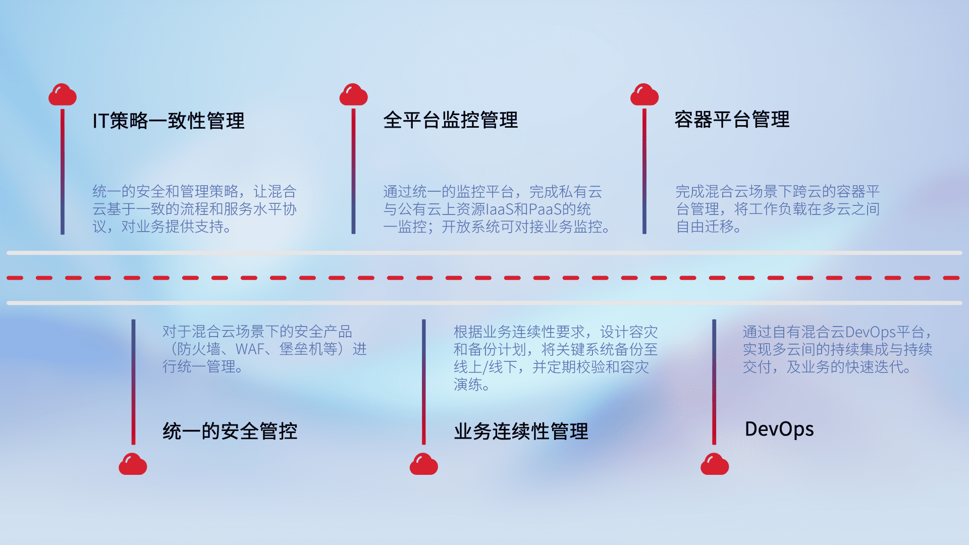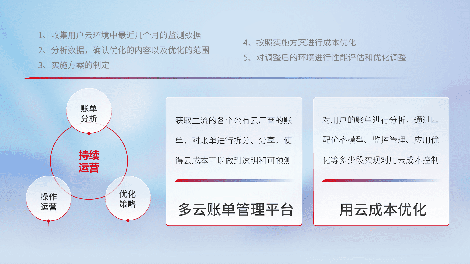 通过多云纳管,,,,以统一的资源数据模型把客户的云资源进行抽象和封装,,,,进而实现对多云资源的统一操作,,,保障云资源管理的可靠性、、、、稳定性与可用性。。。。量身定制化运维内容,,配置、、、、开发运维、、补丁管理、、备份、、、监控、、认证和访问管理、、、审计和日常巡检等,,保障在用云过程中的可靠度,,,,稳定度以及高可用率。。。