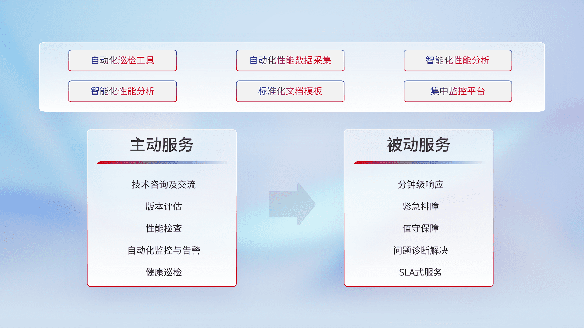 智能化工具和标准化文档,,保障服务质量,,,提供主动服务(包含技术咨询、、、、版本评估、、、性能检查、、、、自动化监控与告警、、、、健康巡检)和被动服务包含(分钟级响应、、紧急排障、、、、值守保障、、、、问题诊断解决、、SLA服务)。。